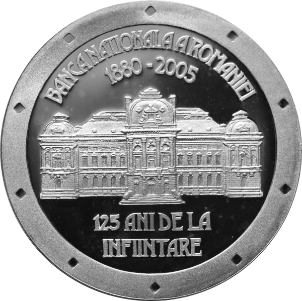 The National Bank of Romania's façade at 25 Lipscani St. features a semicircular engraving of "BANCA NAŢIONALĂ A ROMÂNIEI" and the years "1880-2005." Below the building's model, the two-line inscription "125 ANI DE LA ÎNFIINŢARE" is engraved.