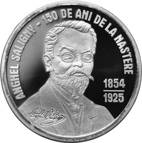 Description: The center features the Cernavodă Bridge, Anghel Saligny's major achievement, above the Romanian coat of arms and "ROMANIA," and below the inscription "PODUL DE LA CERNAVODA," the year "2004," and the face value "500 LEI."