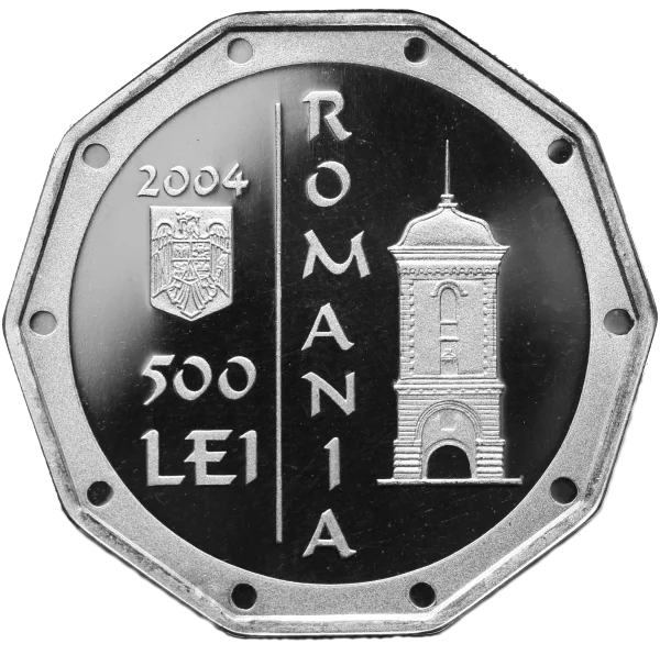 Description: Cotroceni Monastery church; circularly engraved above with "MONUMENTE DE ARTA FEUDALA CRESTINA"; below the image, "BISERICA MANASTIRII COTROCENI"; with the years "1679-2004" engraved at the bottom.