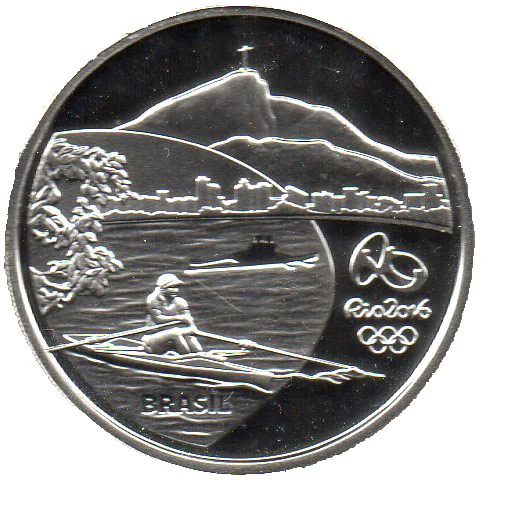 Rowing at Lagoa Rodrigo de Freitas with Corcovado Mountain, the Rio 2016 logo, and "Brazil."