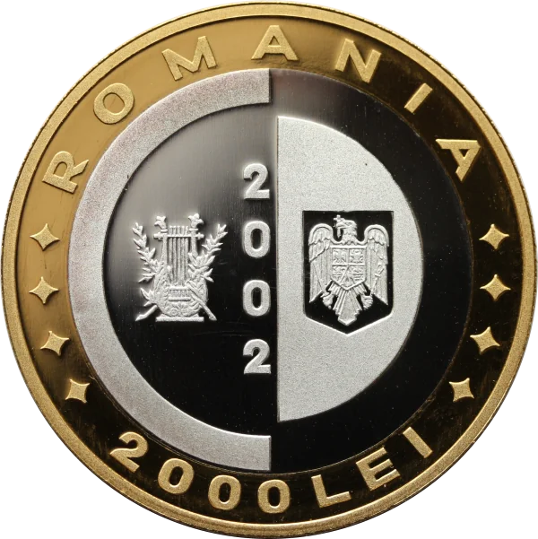 Silver center: Lyre, "2002," Romania's Coat of Arms.