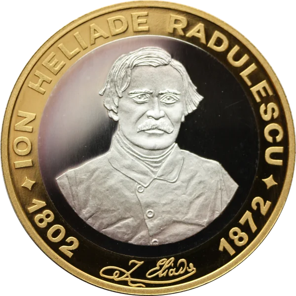 Silver center: portrait of Ion Heliade Rădulescu. Gold ring: his birth and death years "1802" and "1872", the circular inscription "ION HELIADE RADULESCU", and his facsimile signature below.