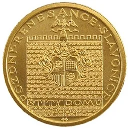 Three heraldic beasts, the town's name, and three historic gables in Slavonice.