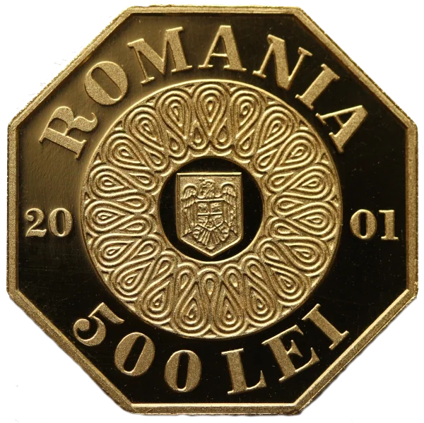 A round medallion featuring Romania's Coat of Arms in the center, encircled by "ROMANIA," with the year "2001" and face value "500 LEI."