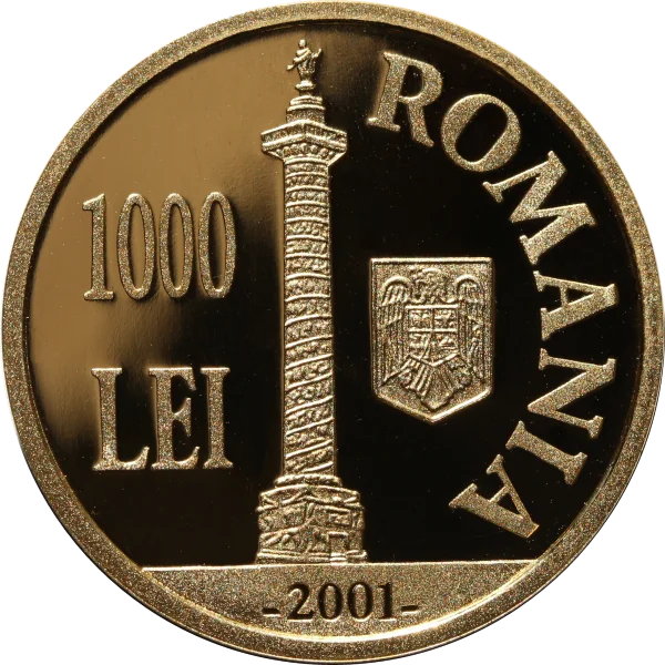 Center: Trajan's Column, Romania's coat of arms, and "1000 LEI." Circular inscription: "ROMANIA." Below: the year "2001."
