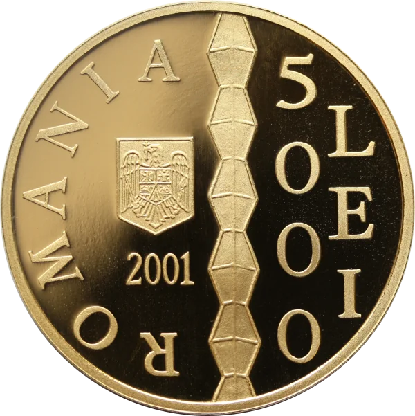 Romania's Coat of Arms; the vertical "5000 LEI" and year "2001"; the circular inscription "ROMANIA"; center, The Endless Column.