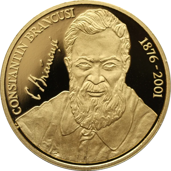 Constantin Brâncuşi's bust; circular inscription "CONSTANTIN BRANCUSI 1876-2001"; sculptor's signature facsimile on the left.