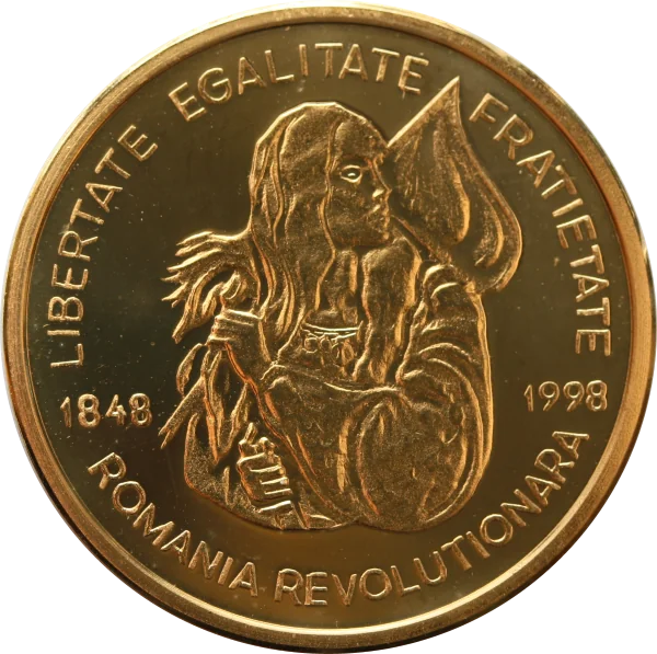 A central effigy of a young woman, symbolizing Revolutionary Romania, is encircled by the motto "LIBERTATE EGALITATE FRATIETATE" above and "ROMANIA REVOLUTIONARA" with the years "1848" and "1998" below.