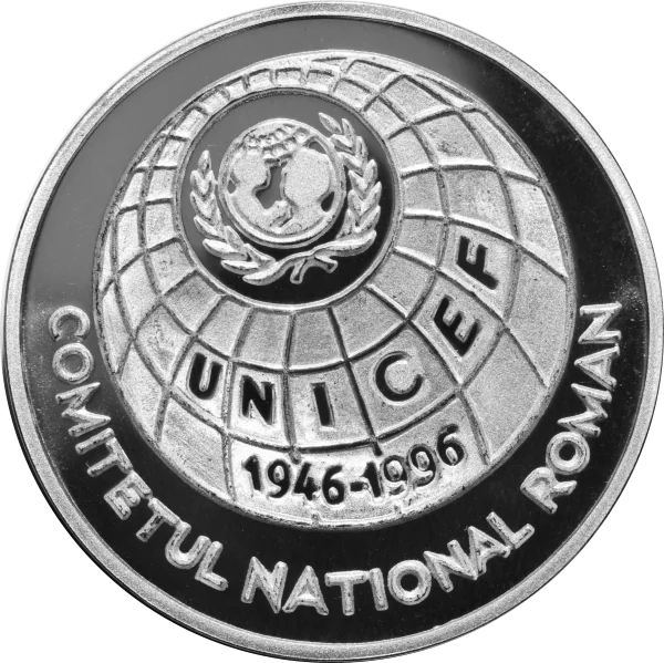 Earth engraved with UNICEF Romania emblem; below, "UNICEF 1946-1996" and "COMITETUL NATIONAL ROMAN" encircling.