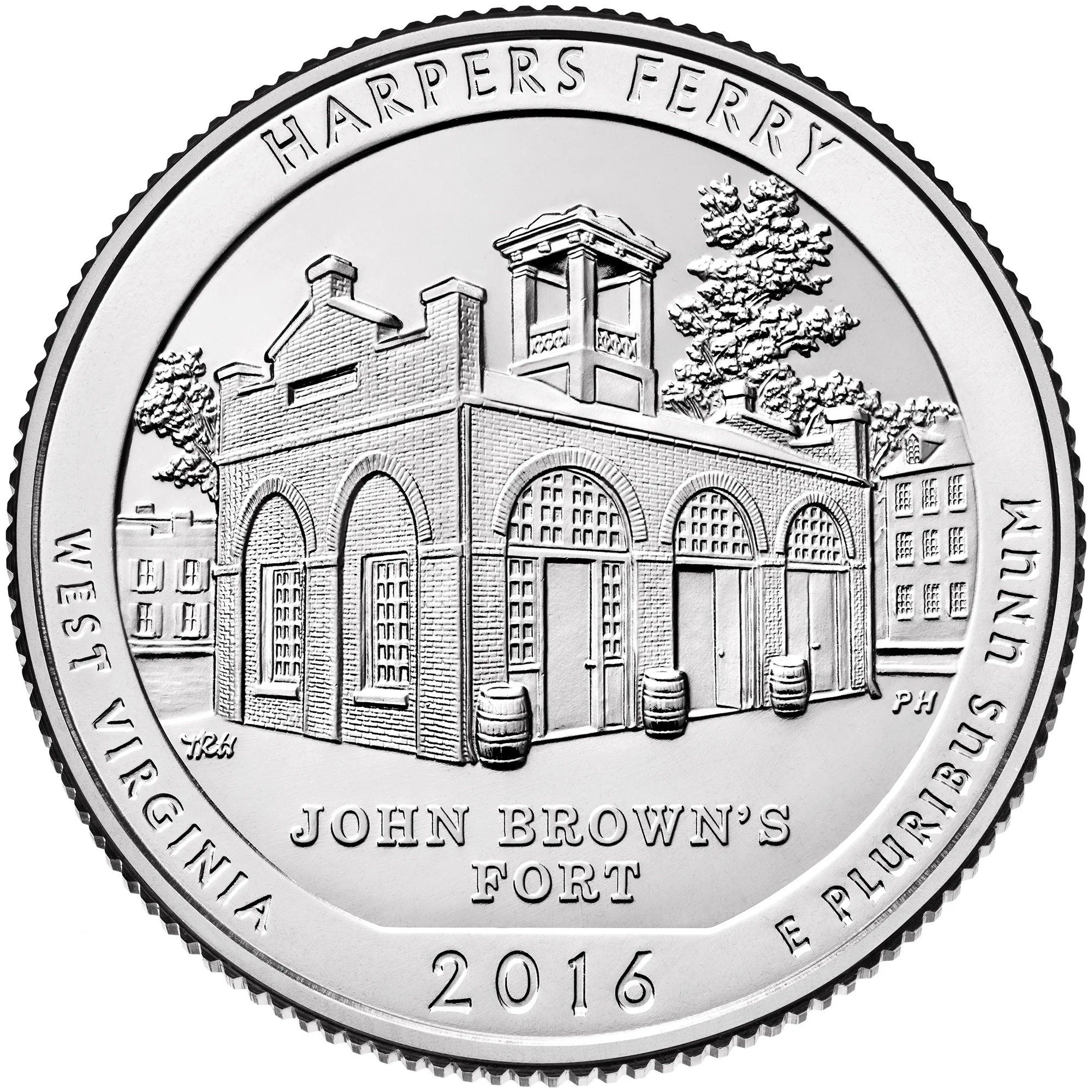 John Brown's Fort, site of his last stand at Harpers Ferry. Inscribed: "HARPERS FERRY," "WEST VIRGINIA," "JOHN BROWN'S FORT," "2016," and "E PLURIBUS UNUM."