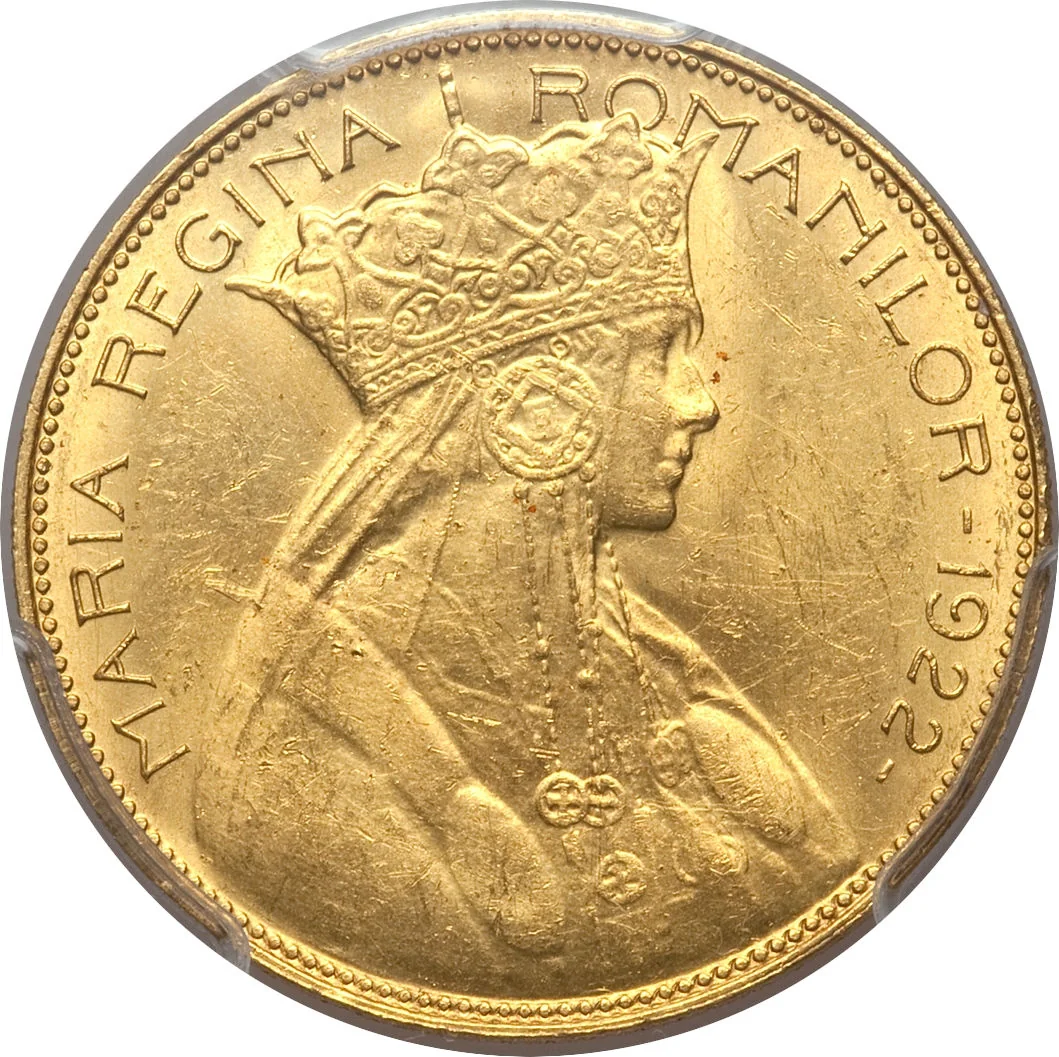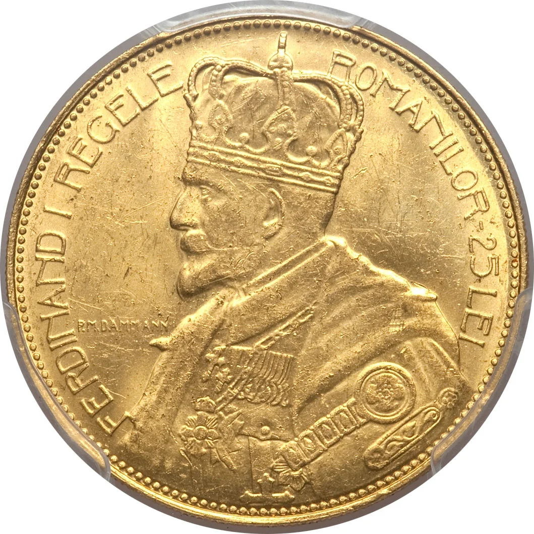 Description: "FERDINAND I KING OF THE ROMANIANS - 25 LEI" legend with the king's crowned left profile. The engraver's name, P. M. DAMMANN, is by his shoulder, within a pearl circle.