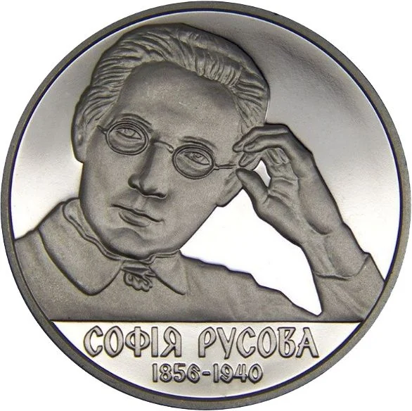 Description: Ukraine's Small Coat of Arms is above. To the right: УКРАЇНА, 2/ГРИВНІ, 2016, and Sofia Rusova's saying: "У ЖИТТІ КОЖНОЇ ШЛЯХЕТНОЇ ЛЮДИНИ МАЄ СВІТИТИ ВЕЛИКА ЯСНА ЗІРКА: ЩАСЛИВА ДОЛЯ РІДНОГО КРАЮ." To the left is an enlightenment lamp. Below is the Mint of the National Bank of Ukraine mark.