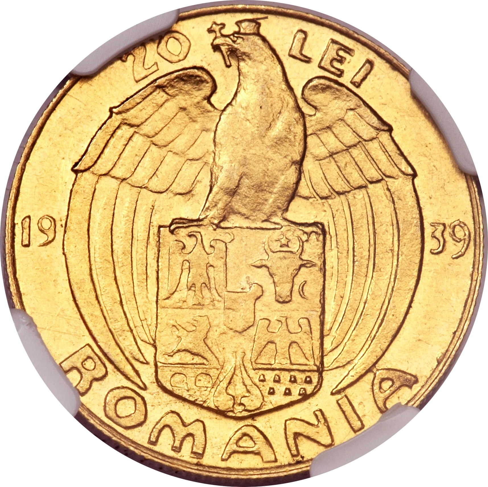 20 LEI, Romania, 1939. Eagle with crown in beak, wings spread, atop the coat of arms.