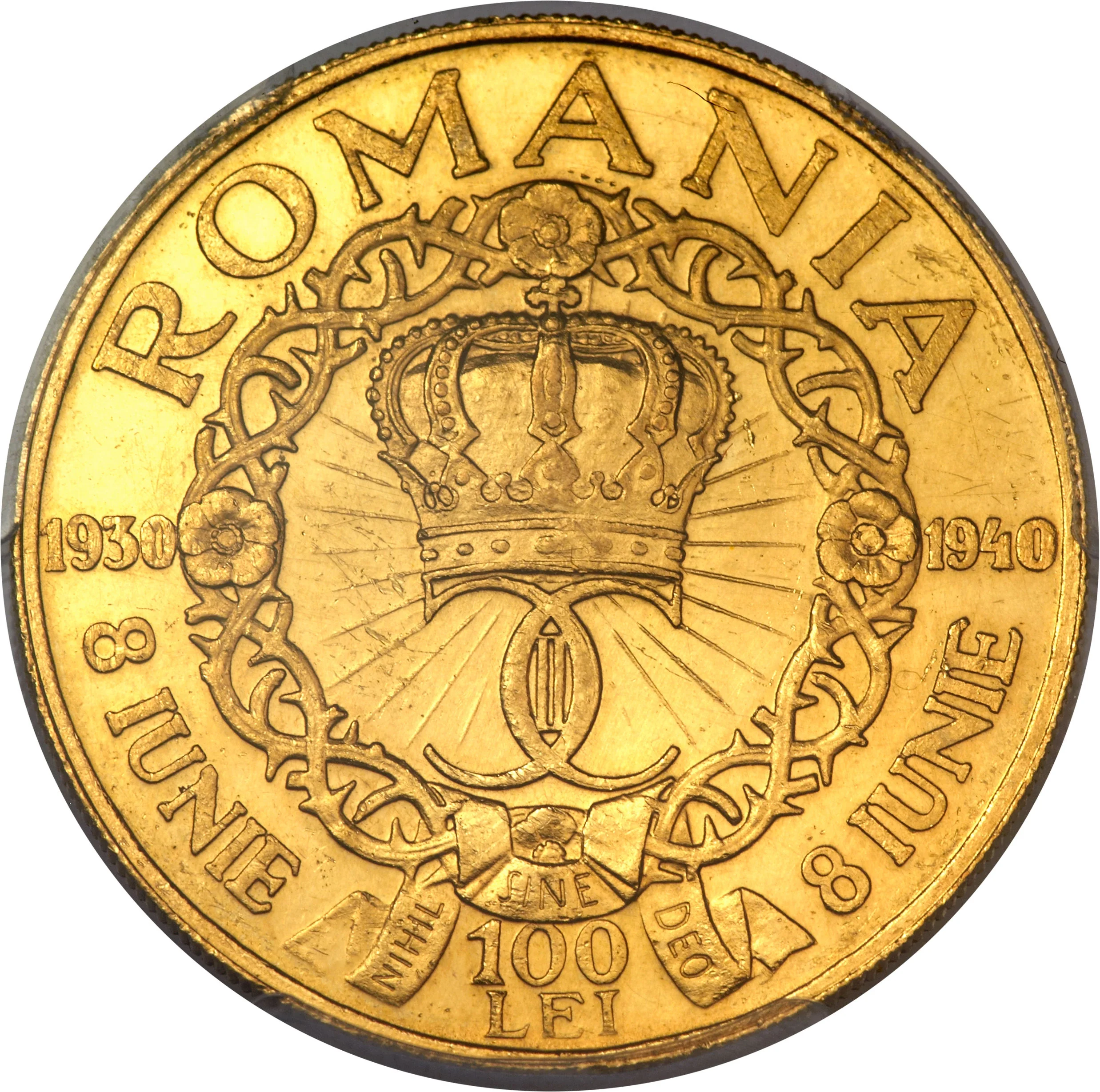 A thorn wreath with three flowers encircles a crown and sun rays. Below the crown is the monogram of Carol II (two C's and a Roman numeral II). A ribbon across the wreath bears "NIHIL SINE DEO." The perimeter reads "ROMANIA, 8 IUNIE 1930, 8 IUNIE 1940," with the face value of 100 LEI.
