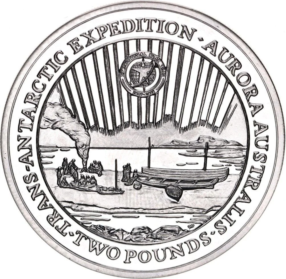 The coin shows Shackleton and his crew, stranded on an ice floe on New Year's Eve 1914, watching the Aurora Australis.