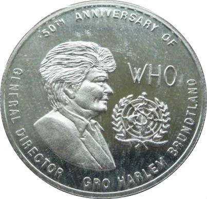 Bust of WHO Director-General Gro Harlem Brundtland with logo.