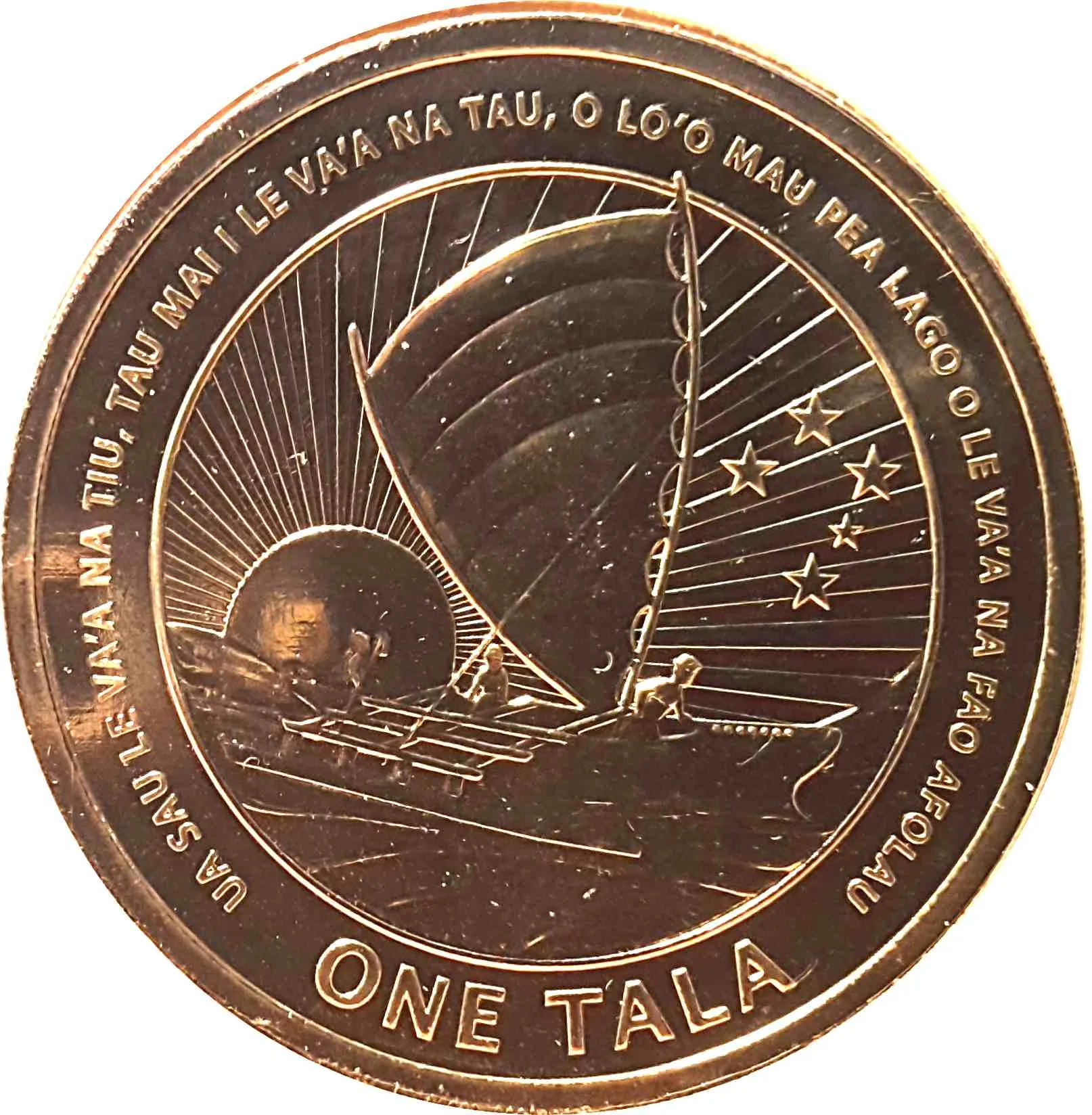 Outrigger boat with a radiating sun, encircled by legend.