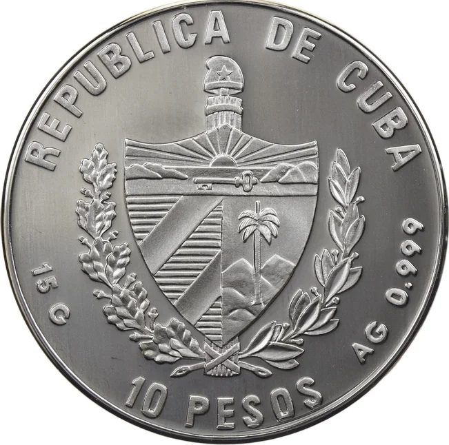 Cuban coat of arms with country name above, face value below, and fineness and weight on the sides.