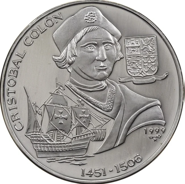 Christopher Columbus and the "Santa María." Coat of arms of Castile and Leon. Name left, dates below. Issue date and mintmark lower left.
