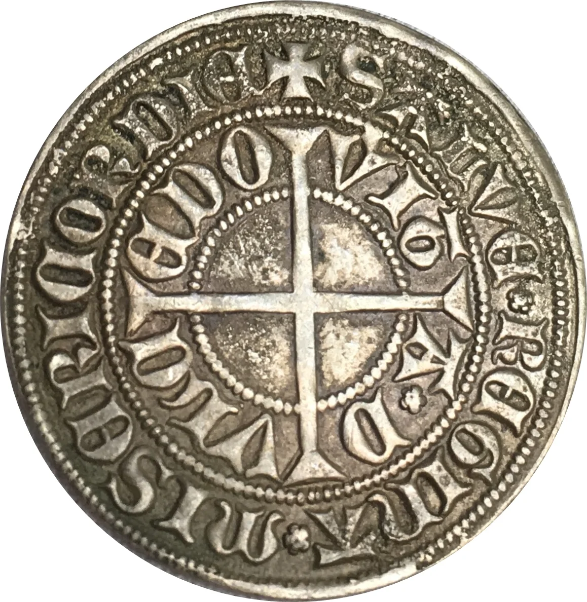 Cross patée with encircling double legend.