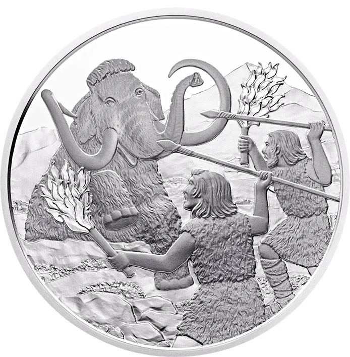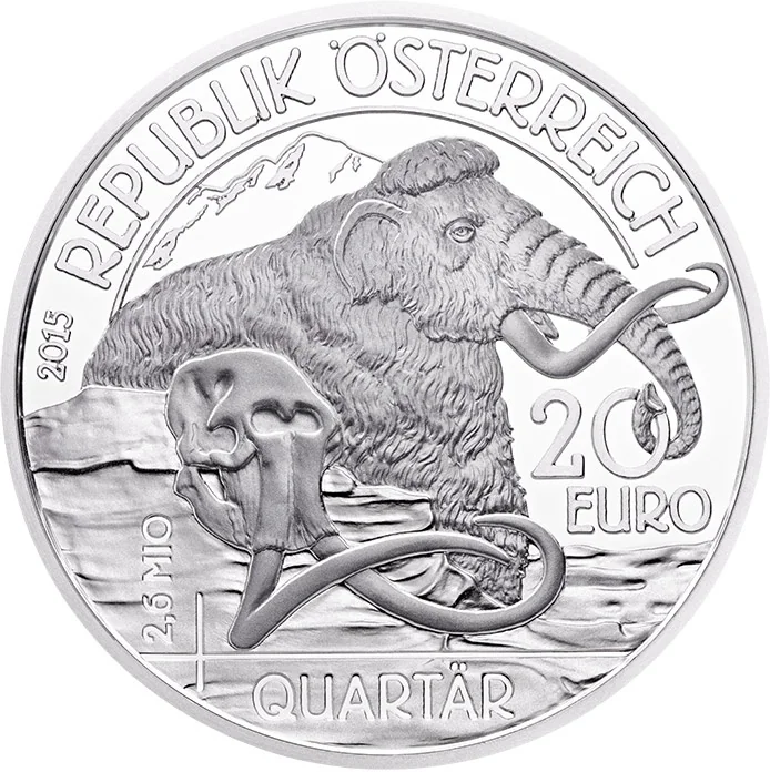 A mammoth in profile dominates the coin's obverse, alongside its skull, tusks, and a Quaternary timeline.