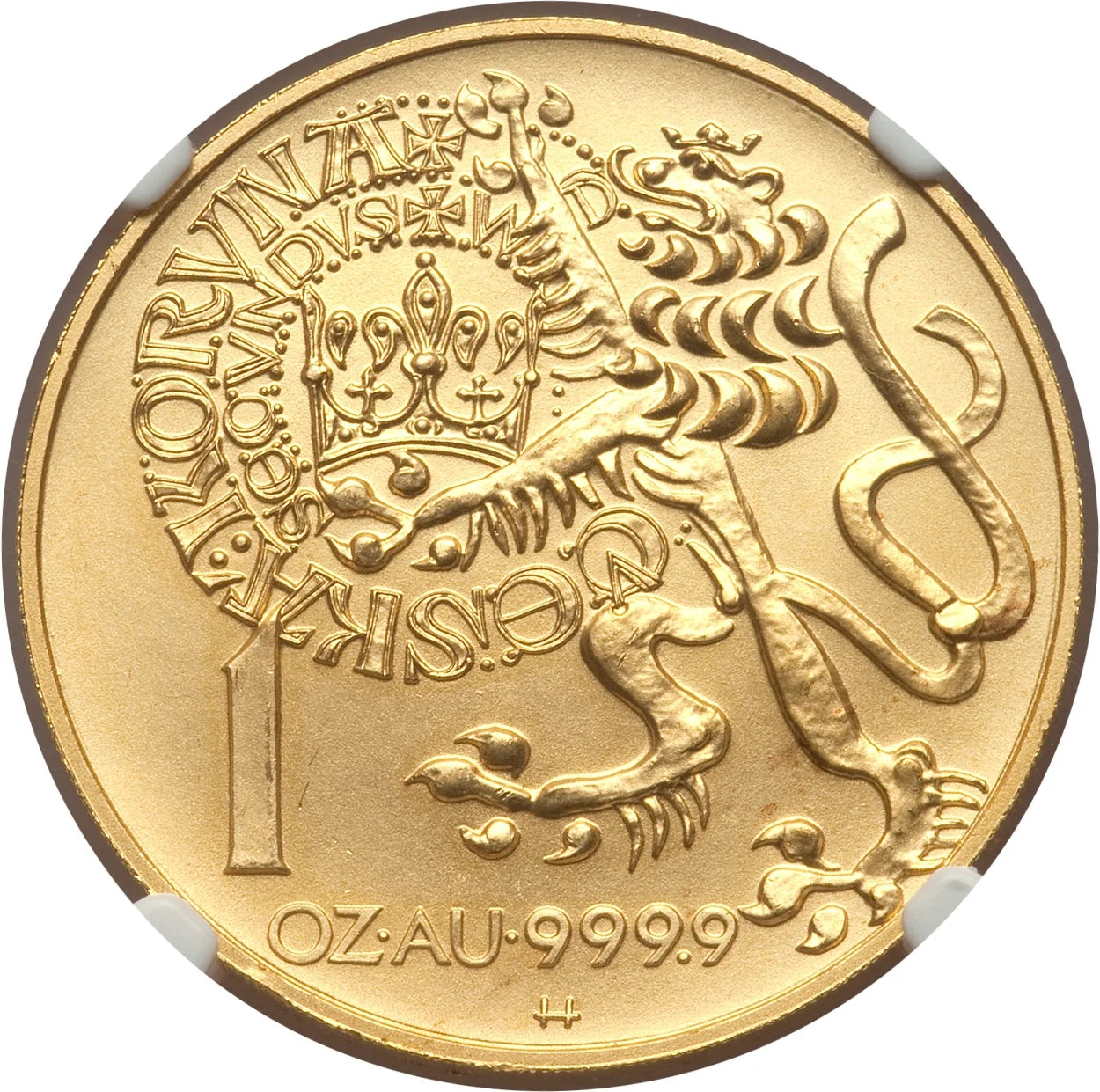 Czech lion with crown, encircled by text honoring Wenceslaus II, reformer of Czech coinage. Metal purity below. Designer's "H" at bottom.