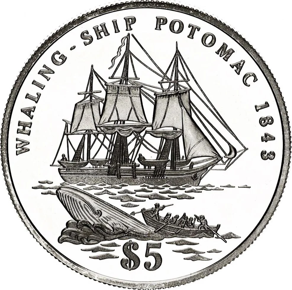 Whalers in a rowboat harpooning a whale, with the ship "Potomac" behind.