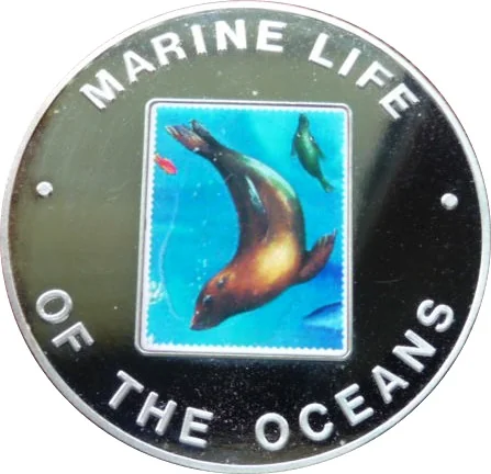 Colored stamp of a swimming seal.