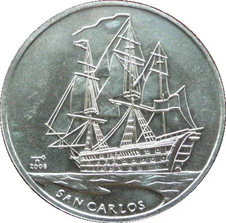 San Carlos, left sailing. Date left, ship name curved above.