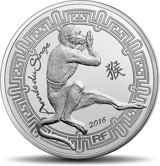 The inner coin depicts a monkey, the ninth fire sign of the Chinese zodiac, surrounded by the inscriptions "Year of the Monkey," "2016," and Chinese characters, all within a frieze near the edge.