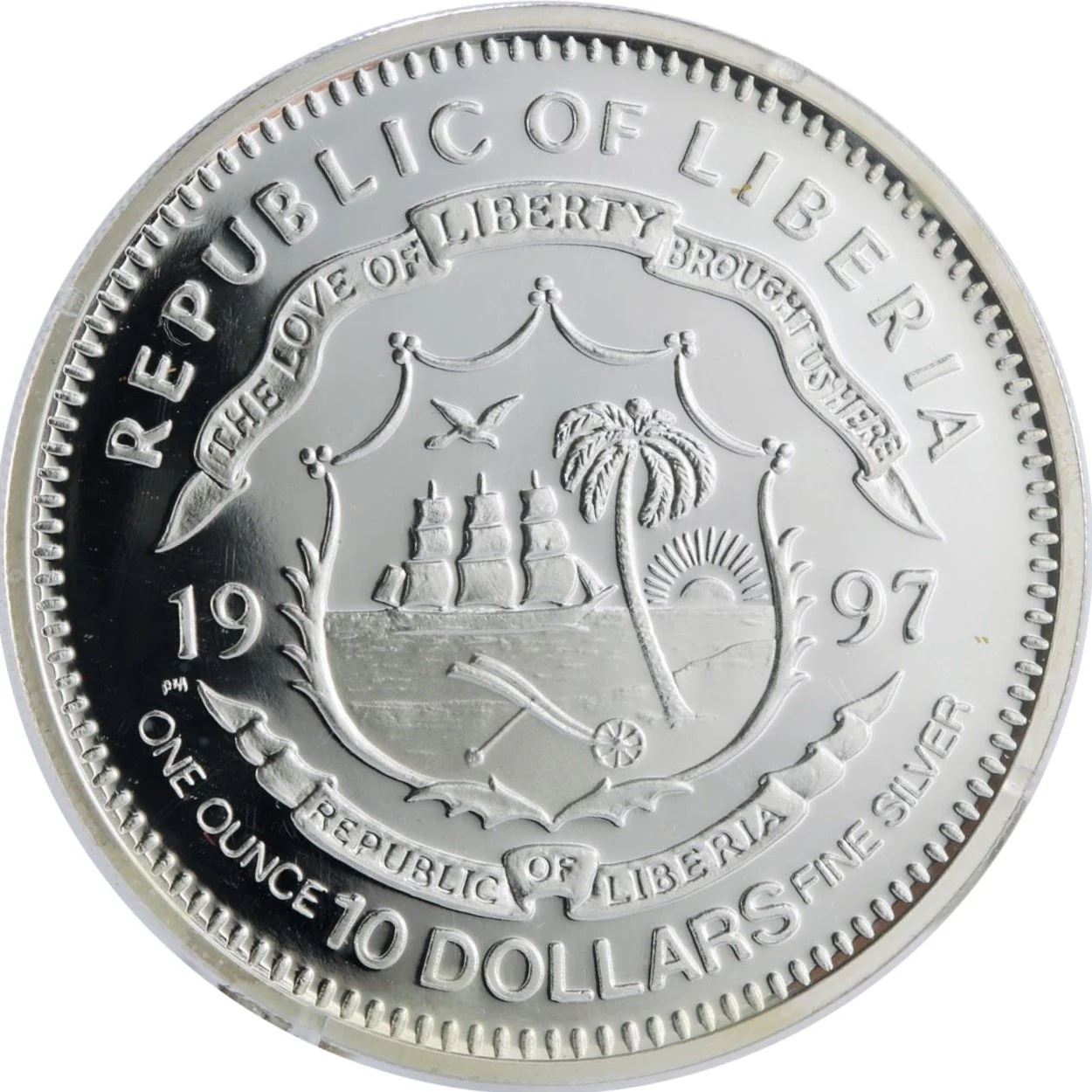 Liberia's coat of arms divides the date, denomination, and fineness below.