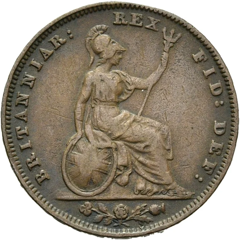 Britannia seated right, holding trident and Union Jack shield, with legend around and national flowers below.