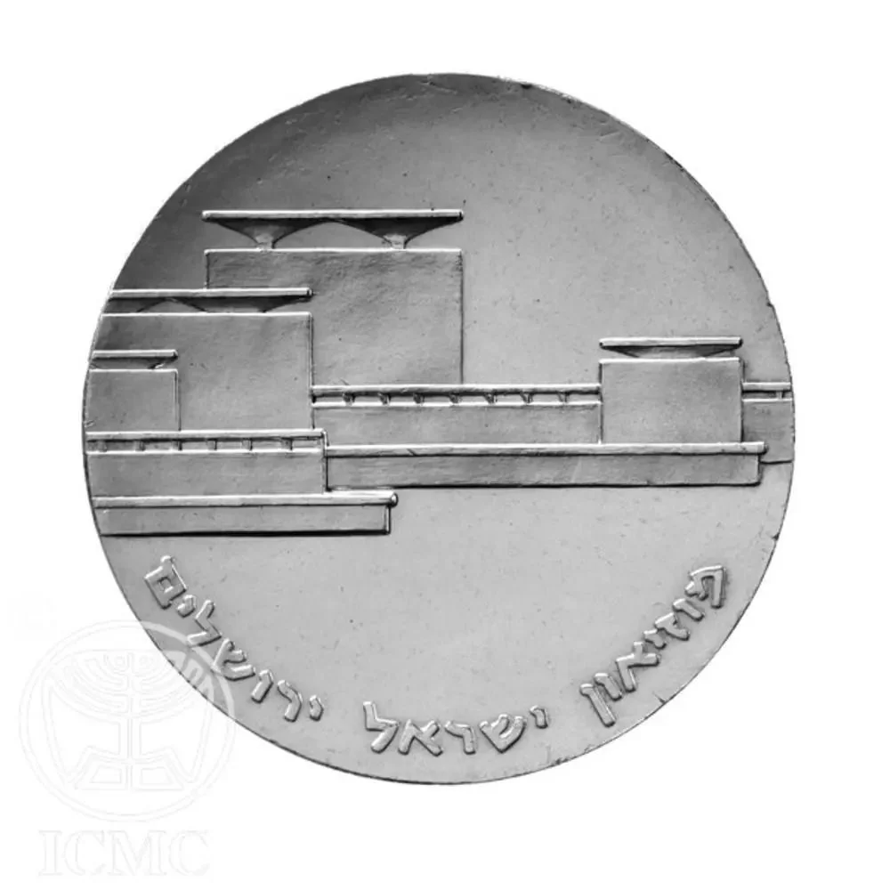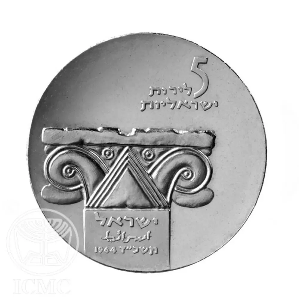 Description: Replica of a 7th–8th century BCE capital and pillar fragment from Ramat Rachel, Jerusalem, in the proto-Aeolic Phoenician style. The pillar bears the name "Israel" in Hebrew and Arabic, the year 1964, and the face value "5 Israeli Lirot" in Hebrew.