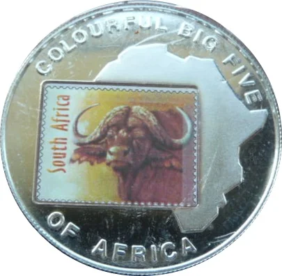 Cape buffalo head facing left on South African stamp over Africa outline.