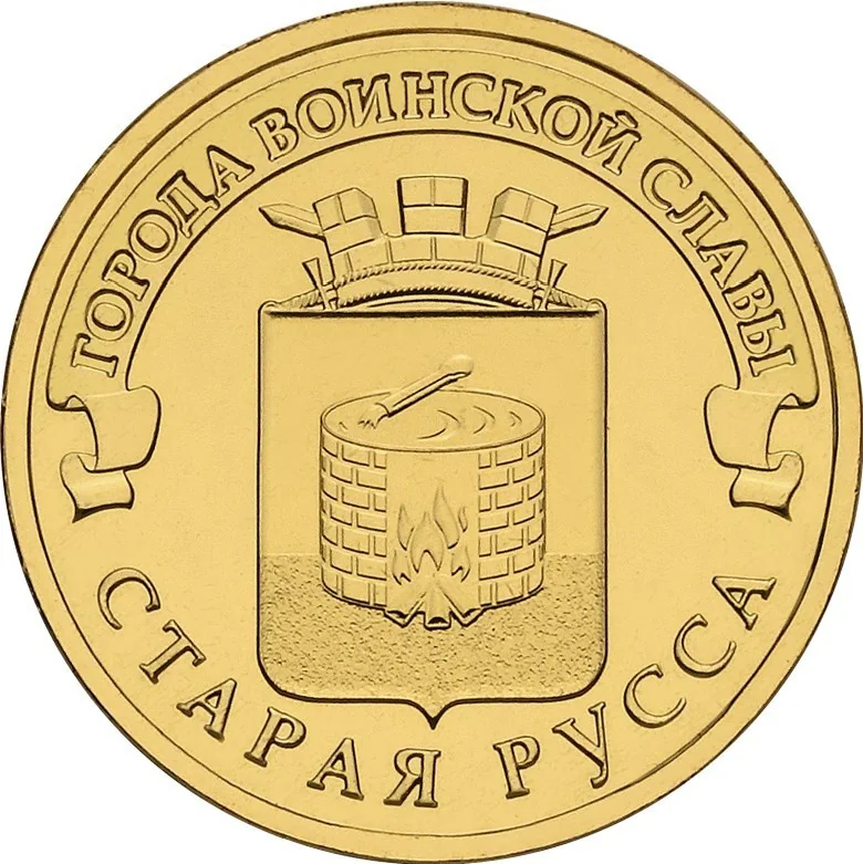 The reverse features the Staraya Russa emblem, encircled by the inscriptions "ГОРОДА ВОИНСКОЙ СЛАВЫ" above and "СТАРАЯ РУССА" below.