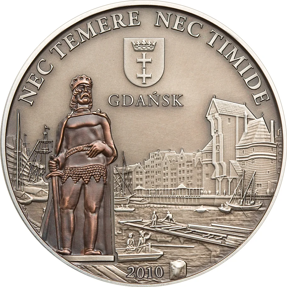 Gdańsk's skyline beneath its coat of arms.