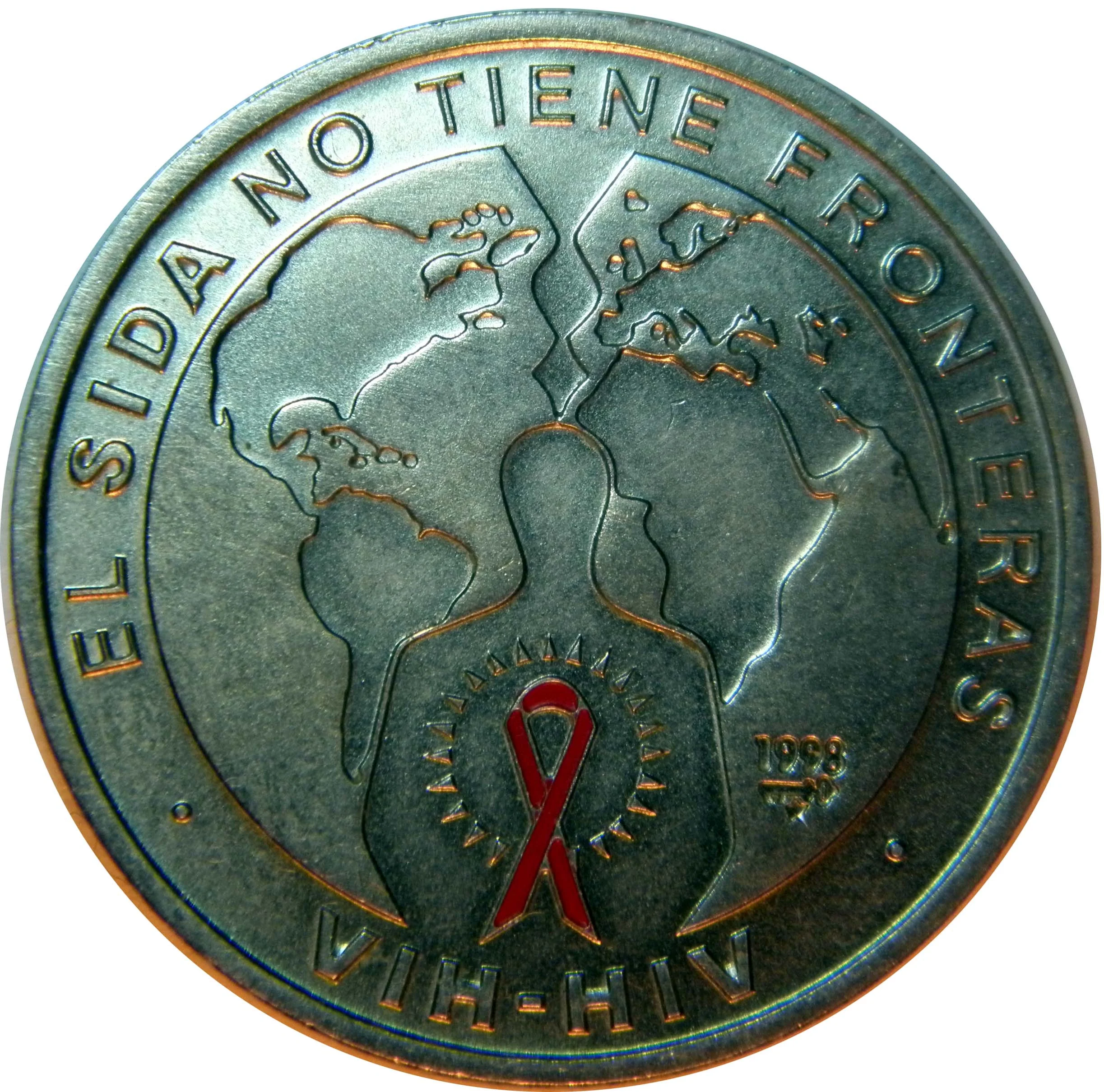 World map edges incuse; front features incuse human silhouette encircled by red ribbon and short rays.