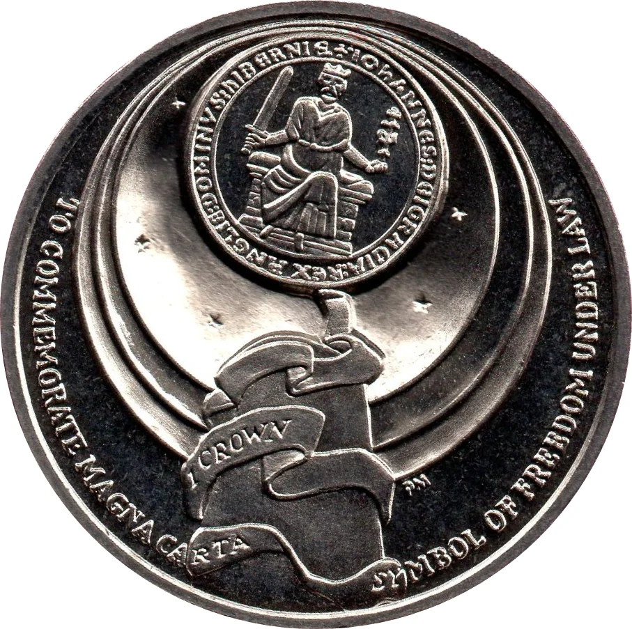Description: This coin replicates the domed Magna Carta memorial at Runnymede. Its dished surface shows the starry dome and central pillar, which bears King John's seal and an inscribed ribbon. It is available in Cupro Nickel and Proof Sterling Silver.