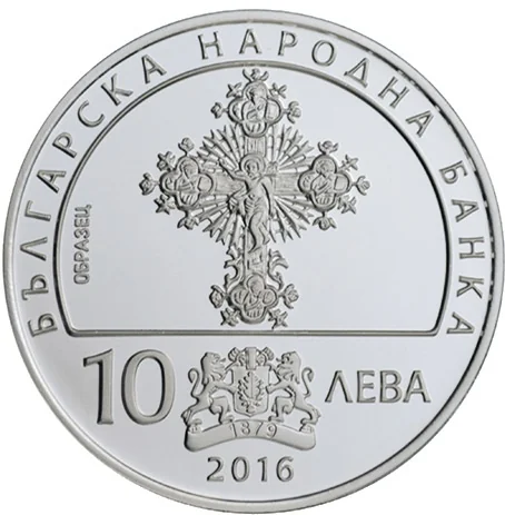 Description: The obverse depicts the Poibrene Cross, encircled by "БЪЛГАРСКА НАРОДНА БАНКА." Below, "10 ЛЕВА" flanks the BNB logo (with '1879' on its strip), and the issue year '2016' is beneath.