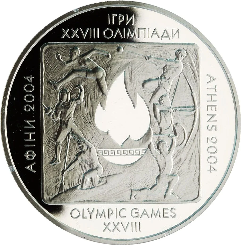 A square background features various sports figures with an Olympic flame cup in the center. Surrounding inscriptions read: "ІГРИ/ XXVIII ОЛІМПІАДИ" (top), "OLYMPIC GAMES/ XXVIII" (bottom), "АФІНИ 2004" (left), and "ATHENS 2004" (right).