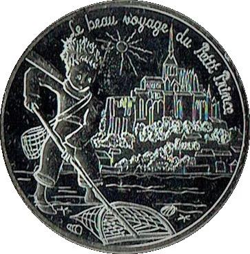 The Little Prince fishes for seashells before the distant abbey of Mont Saint Michel.