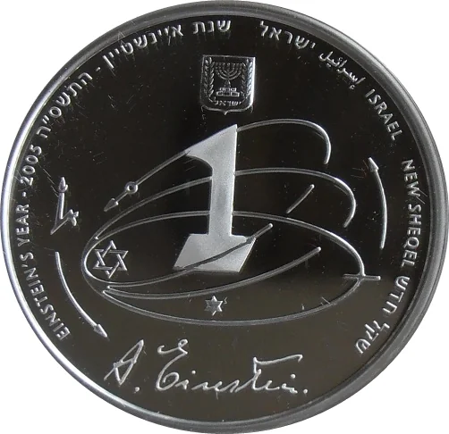 Israeli State Emblem on planetary orbits. "Israel" and "New Sheqel" in three languages. "Einstein Year 2005" in Hebrew and English. Albert Einstein's signature.