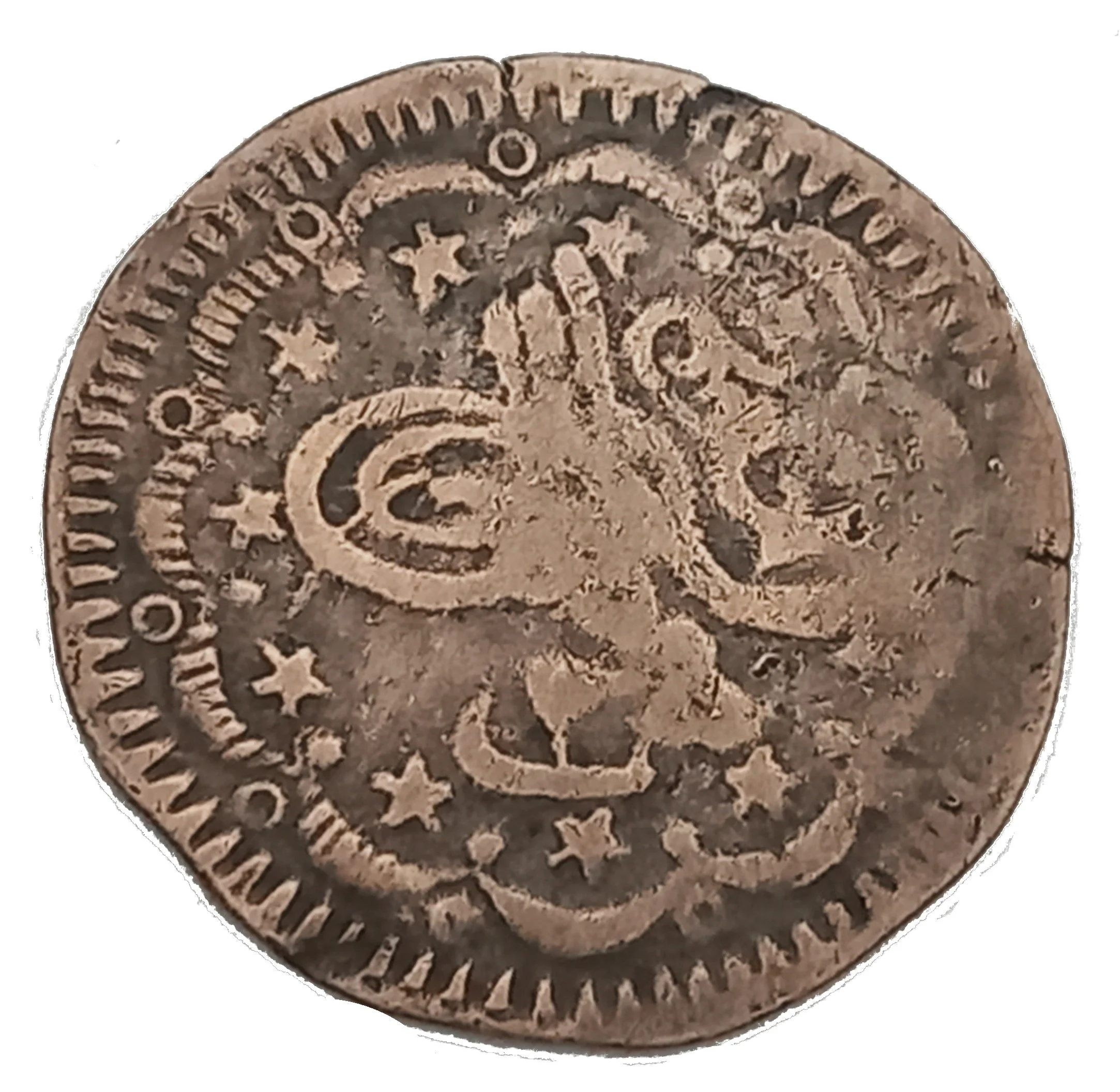 Toughra with "Umla jadida" and value below, bordered by crescents, stars, and circles or dots.