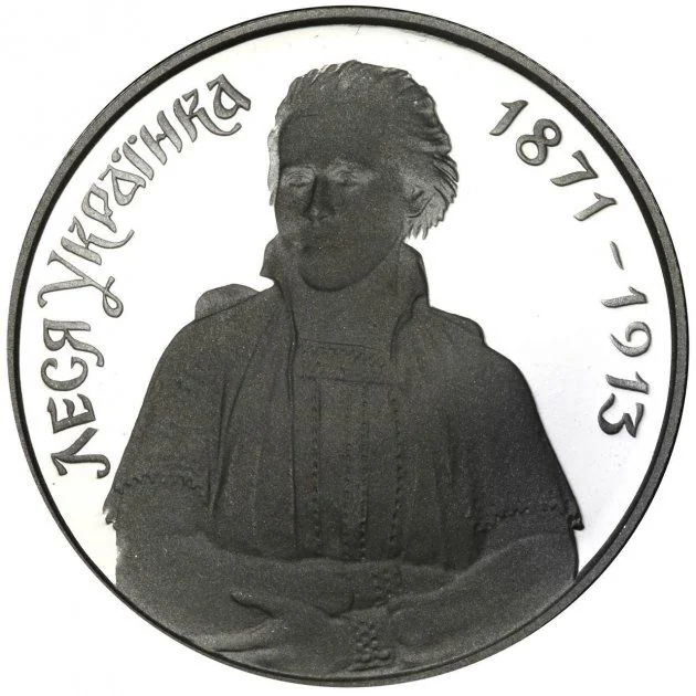 Lesya Ukrainka's portrait. Around the circumference: ЛЕСЯ УКРАЇНКА (left) and 1871-1913 (right).