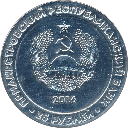 Description: Center: Transniestrian state emblem. Circling it: top, "TRANSNISTRIAN REPUBLICAN BANK"; bottom, "25 RUBLES". Below the emblem, the year "2016".