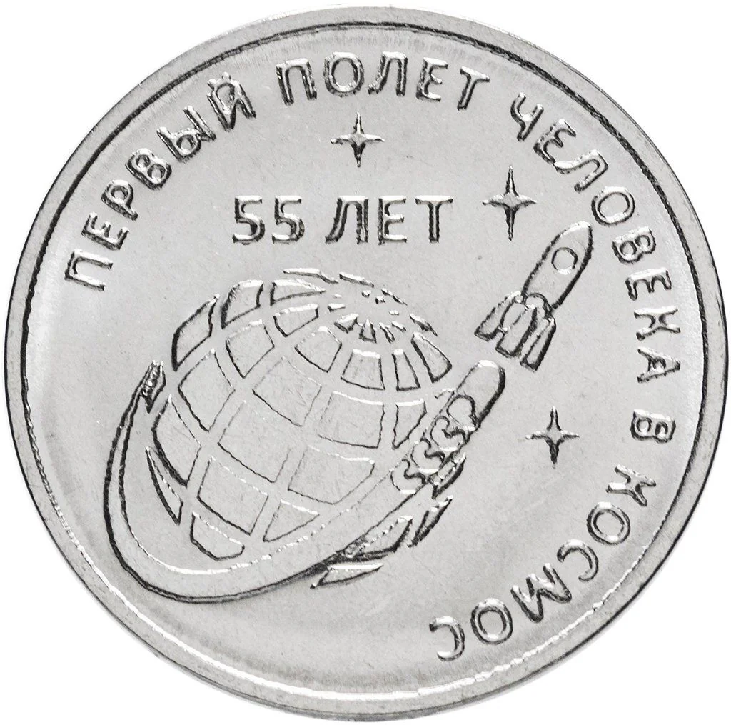 Central globe with missile envelope; above, circular text "ПЕРВЫЙ ПОЛЁТ ЧЕЛОВЕКА В КОСМОС", center "55 ЛЕТ".