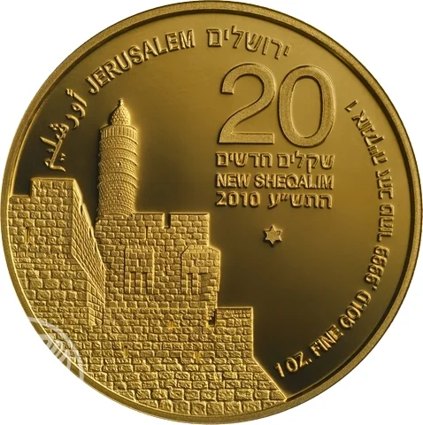 Tower of David above Jerusalem's Old City walls, near Jaffa Gate. "Jerusalem" in English, Hebrew, and Arabic. 20 NIS face value, mint mark and year. Right side: "1 oz. fine gold .9999" in Hebrew and English.