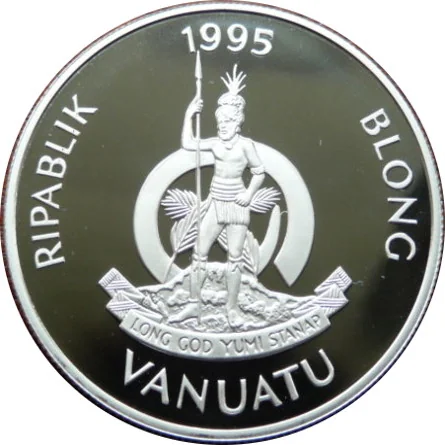 Vanuatu's arms depict a Melanesian warrior before a curved boar's tooth, a scroll reading "LONG GOD YUMI STANAP," and the date.