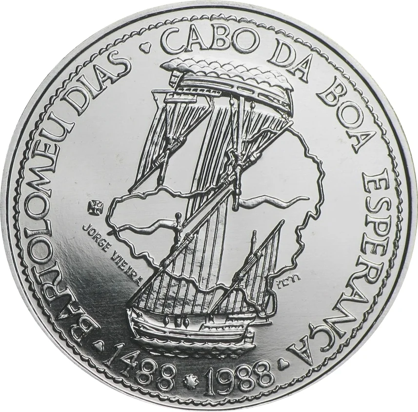 500th anniversary of Bartolomeu Dias rounding the Cape of Good Hope. Features a map of Africa tilted southward, two inverted caravel ships, and the names of the explorer and the Cape, with dates below.