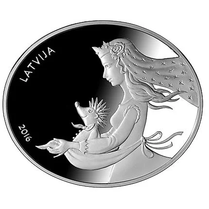 A princess holding a hedgehog in her apron, with LATVIJA above and 2016 below.